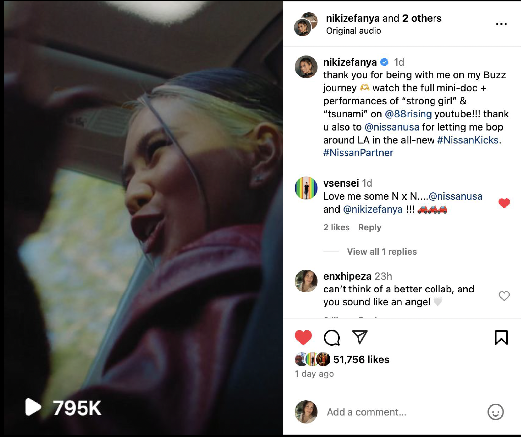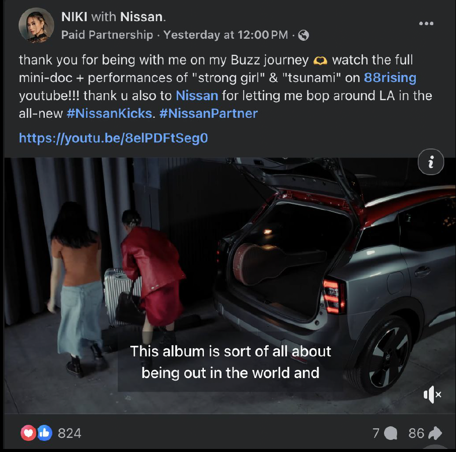 The centerpiece, “Buzzing,” was a 12-minute short docu-film following NIKI on a road trip promoting her new album, Buzz. The film naturally integrated the Kicks into her journey of artistic evolution, showcasing the vehicle’s design, technology, and lifestyle appeal in real-world, aspirational moments. Complementing the docu-film were 60-second brand integrations, custom video edits, and a coordinated social push across NIKI and 88rising channels, amplifying reach and engagement.