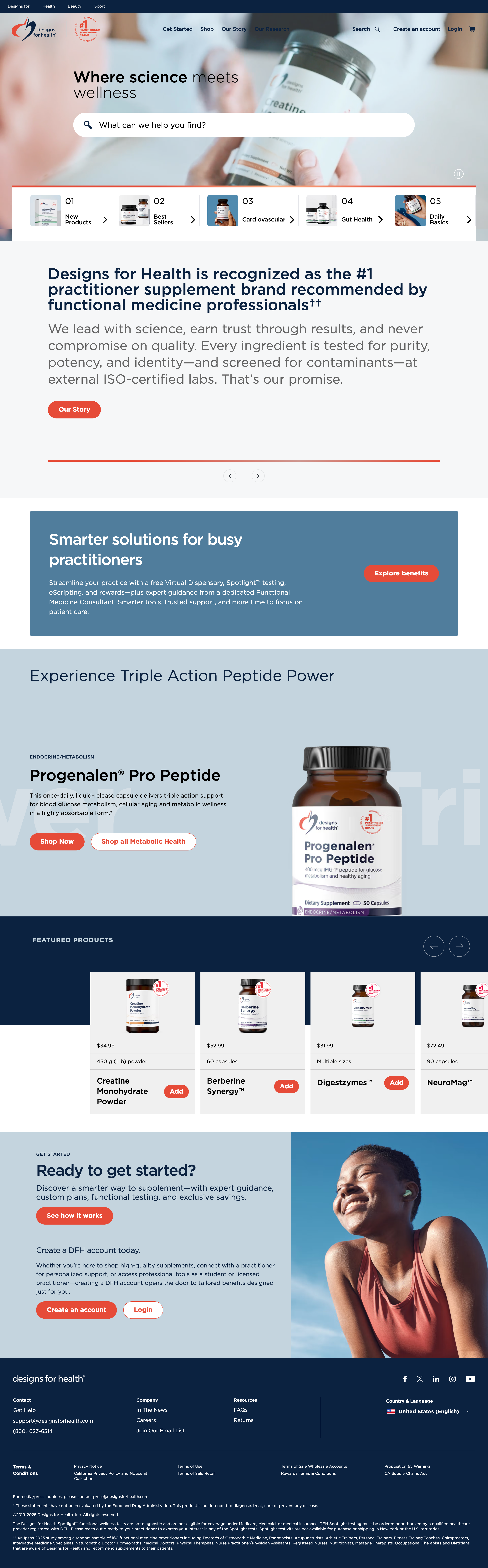This evolution transforms the brand’s practitioner-led legacy into a more inclusive digital experience. This new platform enables guests to explore and purchase products while also connecting with practitioners who can provide personalized care - fostering a more holistic and empowering wellness journey for anyone looking to enhance their well-being. We set out to create a space that encourages discovery and connection - where education, product exploration, and brand storytelling come together seamlessly. Designsforhealth.com is a dynamic digital home that balances usability with storytelling, reflecting the ongoing evolution of Designs for Health and inviting a broader community to engage with its mission of lifelong wellness.