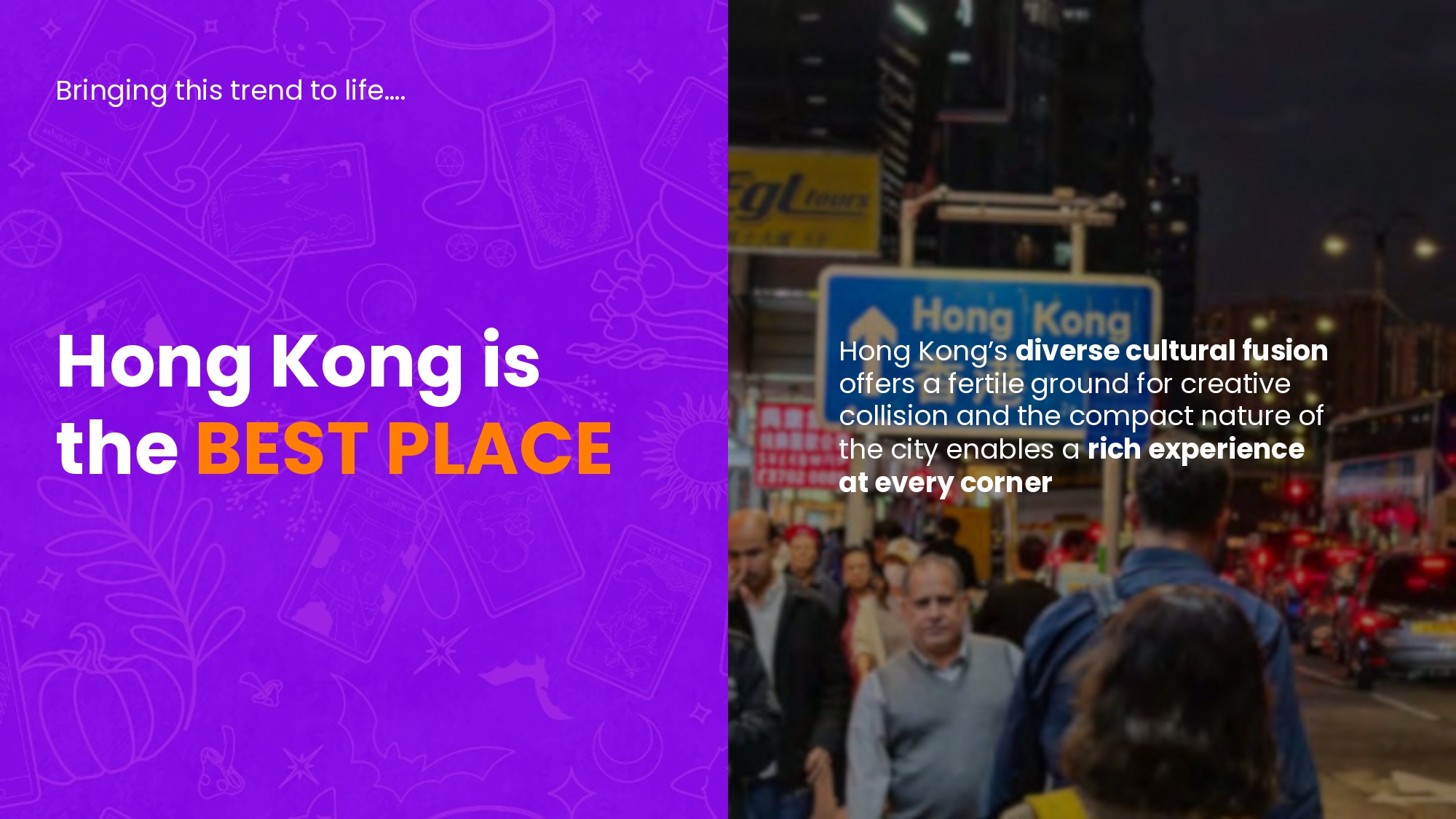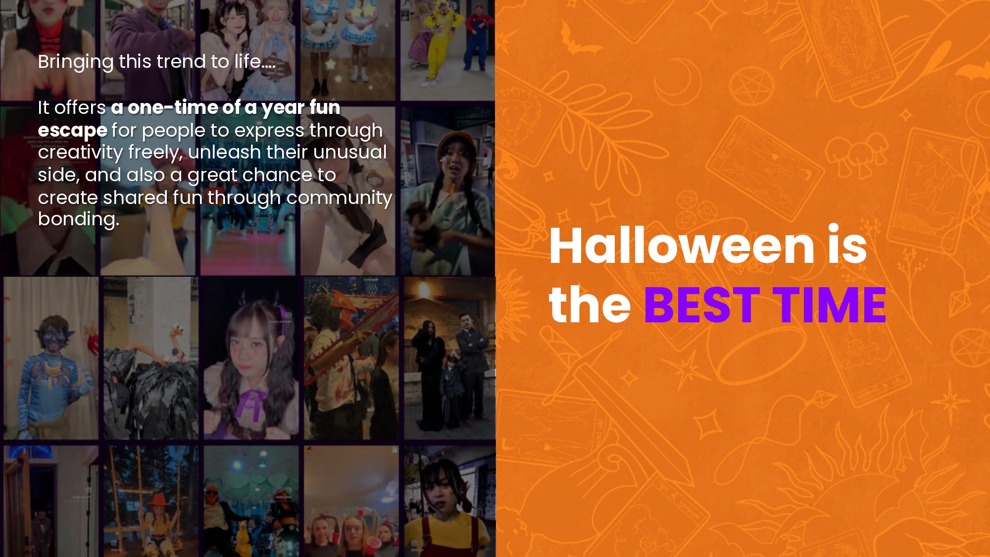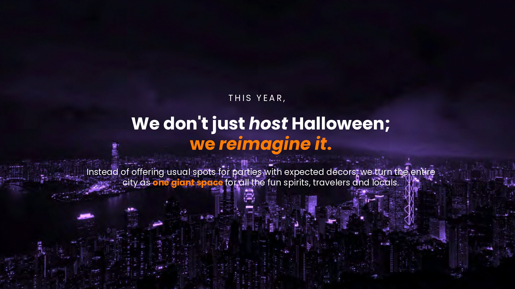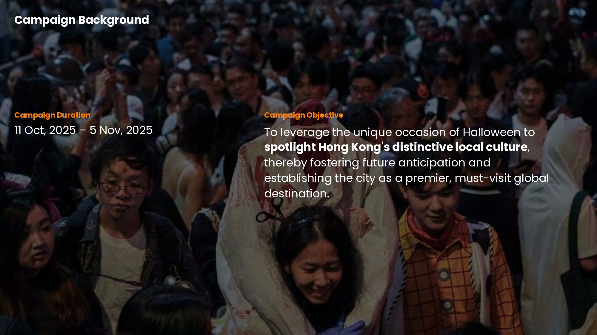 Recognizing Halloween as a unique opportunity for creative collision and shared community fun, our idea was to move beyond simply hosting the festival. Instead, we reimagined it as an immersive journey of participation that surpasses passive tourism. We transformed Hong Kong into an unparalleled global stage, empowering everybody to show their distinctive Halloween playful spirit and showcasing the city's unique cultural vibrancy, while actively inviting travelers to join this authentic, co-created spectacle. We created an invaluable chance for people from all walks of life to connect through creative festive expression, making Halloween a truly inclusive celebration for everyone, everywhere.