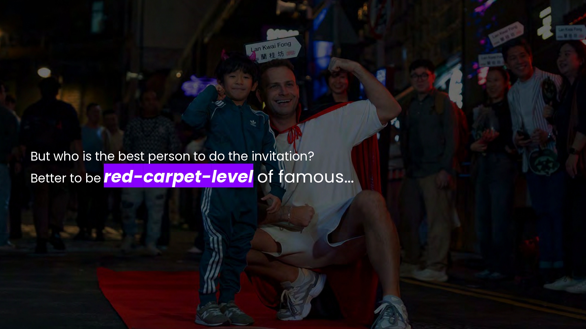 To bring this idea to life, we disrupted the conventional one-way influencer model by strategically leveraging Andrew Wave, 'the Red Carpet Boy', as a living mobile stage delivering a city-wide call to action: "Dress up, show up!". This epic invitation was open to everyone regardless of age, profession, or background. His red carpet brought out everyone. From local icons like Allan Zeman and Mickey Mouse from Hong Kong Disneyland, to world-class talent like the co-founder of the top bar at World's 50 Best Bars, and everyday heroes like villain-hitting auntie and tram operator. Through authentic street snaps, we showed global audience the city's authentic celebrative spirit for Halloween.